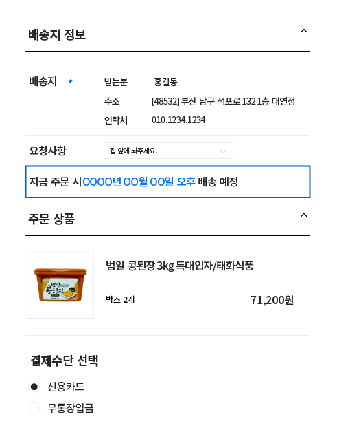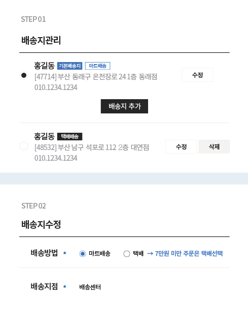 마트배송은 사업자등록증에 등록된 주소지만 배송이 됩니다. 집주소로 변경하여 주문해주실 경우 주문이 취소될 수 있습니다.