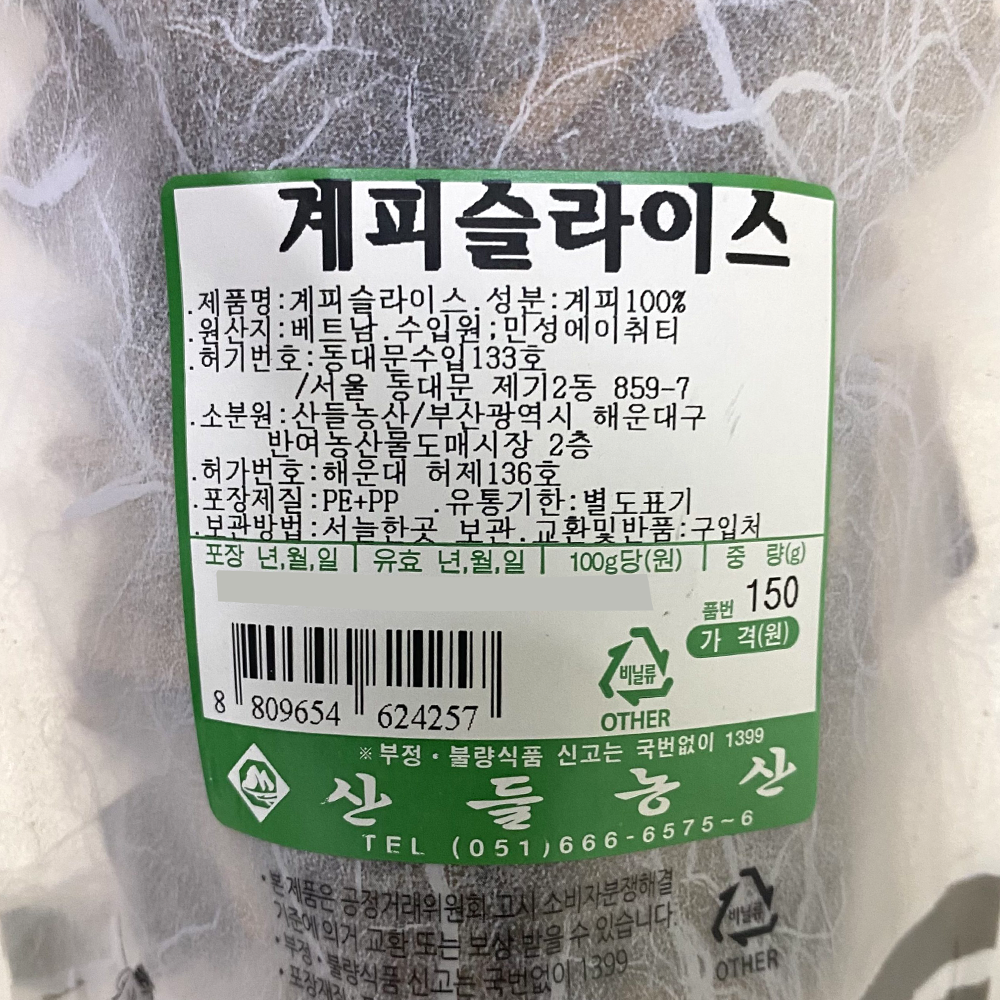 | 품목 또는 명칭 | 계피 슬라이스·150g(베트남산)/산들농산 |