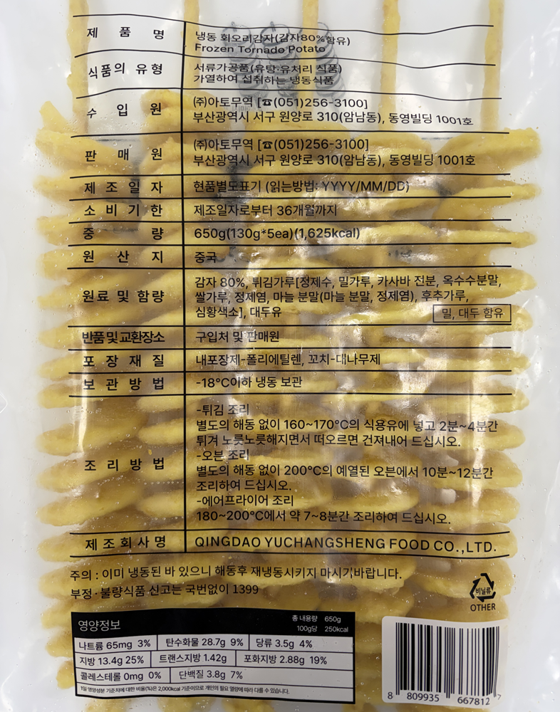 | 제품명 | 냉동 회오리감자 650g/아토무역 |