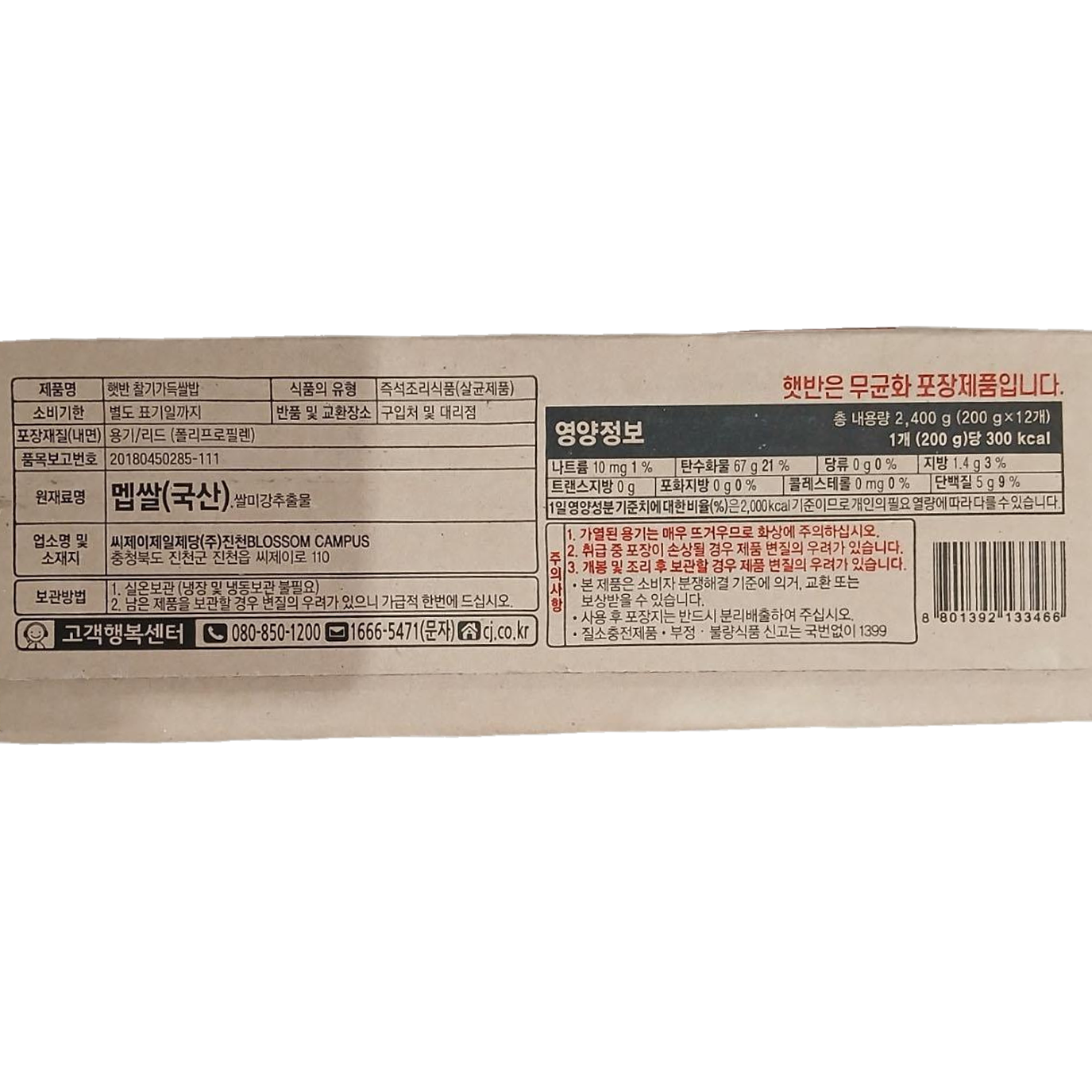 | 제품명 | 햇반 찰기가득쌀밥 200g*12입(박스) /CJ |