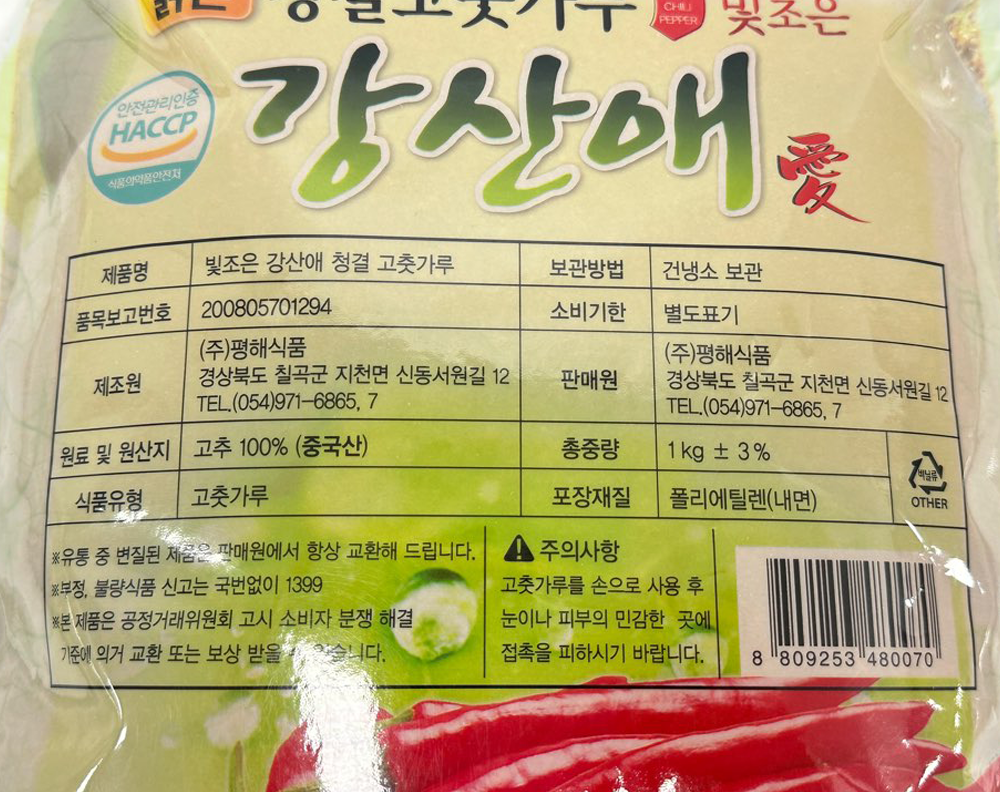 | 품목 또는 명칭 | 강산애)굵은 청결고춧가루·1kg(중국산)/평해식품 |