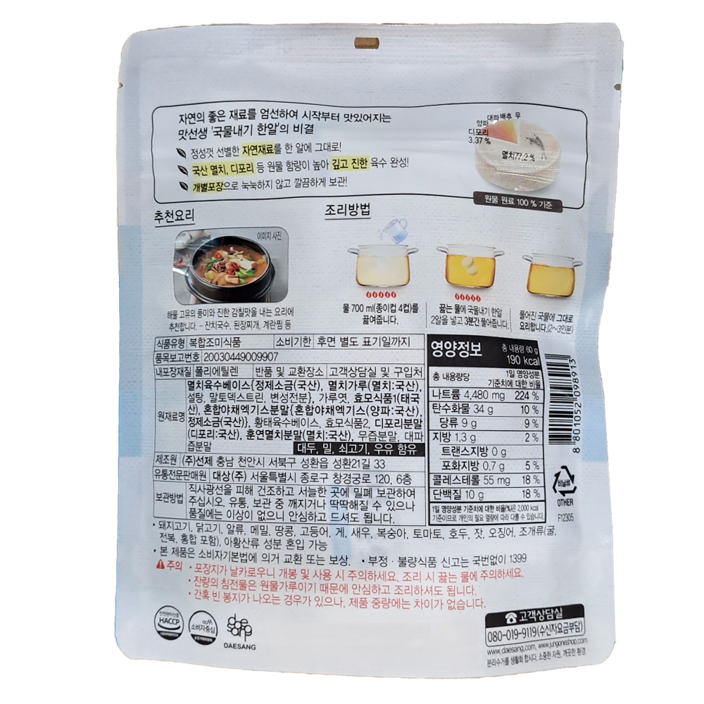 | 제품명 | 맛선생 멸치디포리 국물내기한알 60g/대상 |