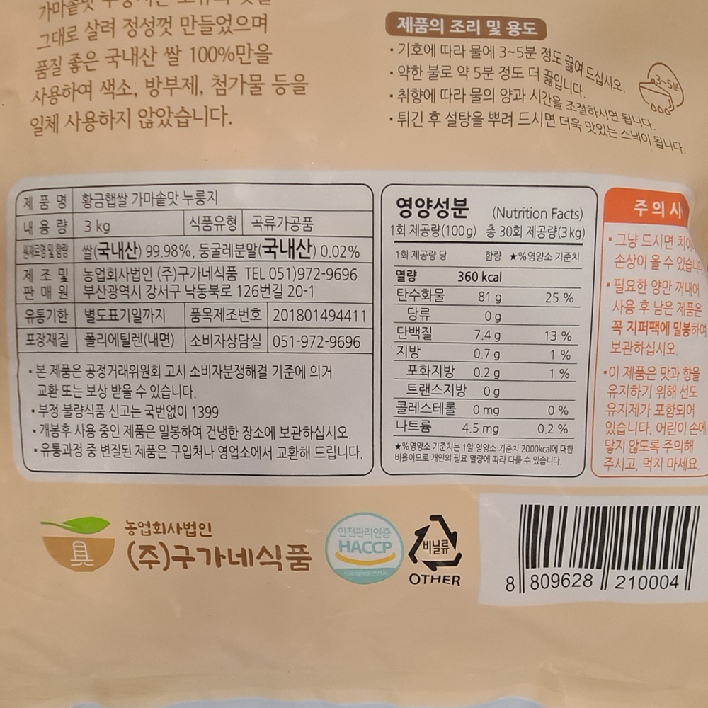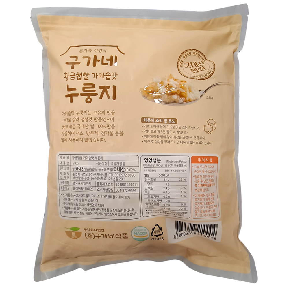 | 제품명 | 가마솥맛 누룽지 3kg (국산쌀)/구가네식품 |