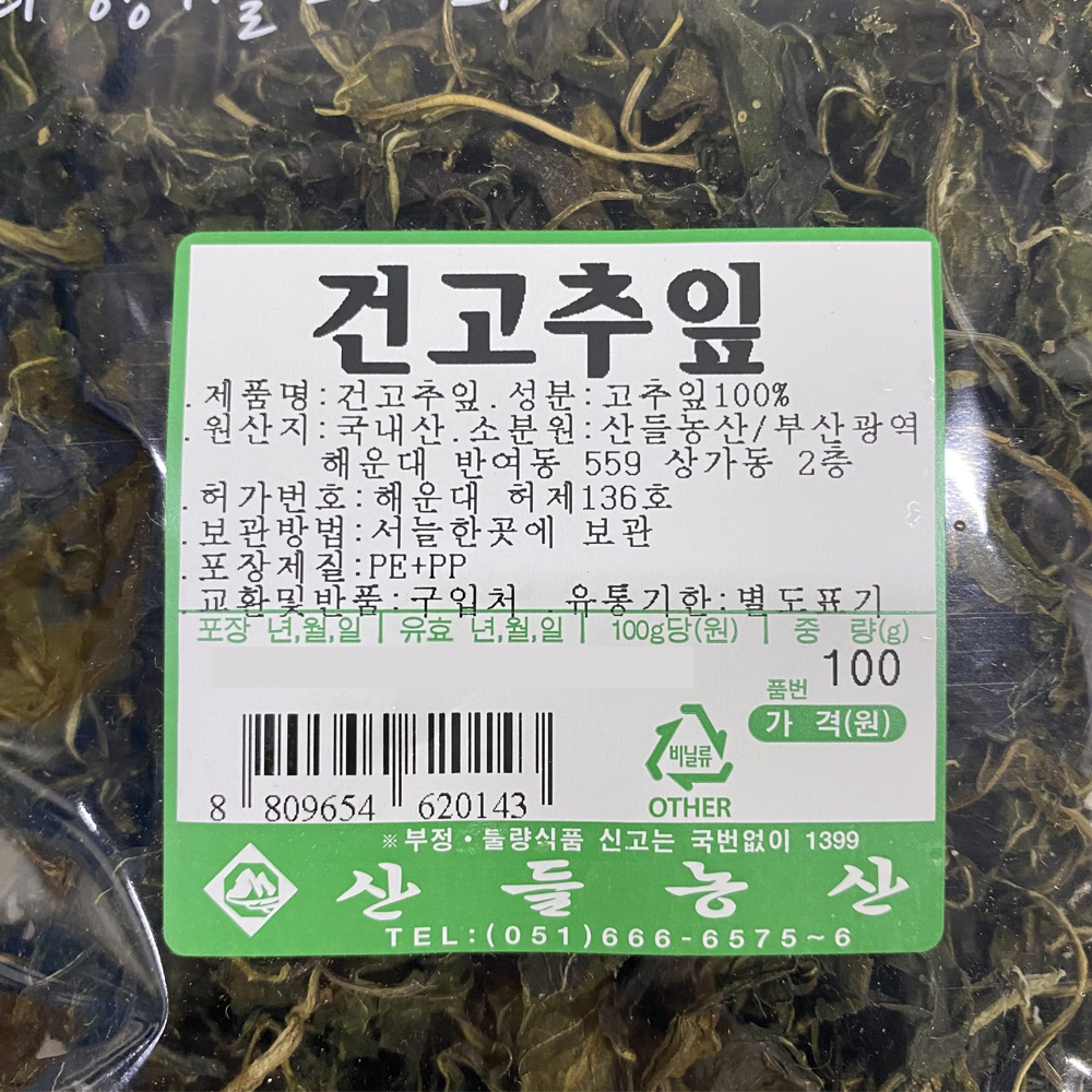 | 품목 또는 명칭 | 건고추잎·100g(국내산)/산들농산 |