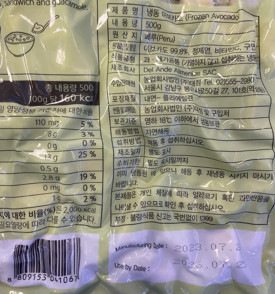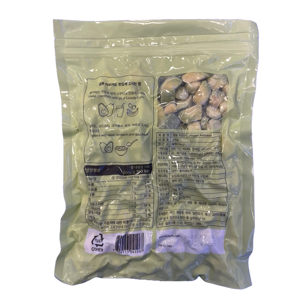 | 품목 또는 명칭 | 냉동 아보카도 다이스·500g (페루산)/대정 |