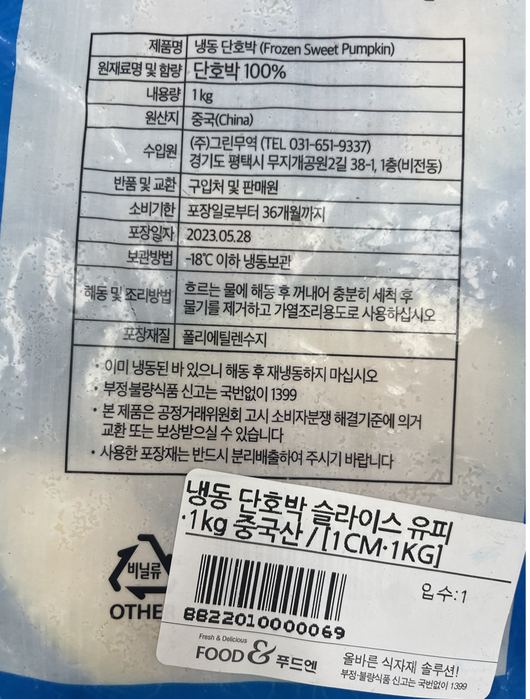 | 품목 또는 명칭 | 냉동 단호박 슬라이스(유피)·1kg/중국산 |