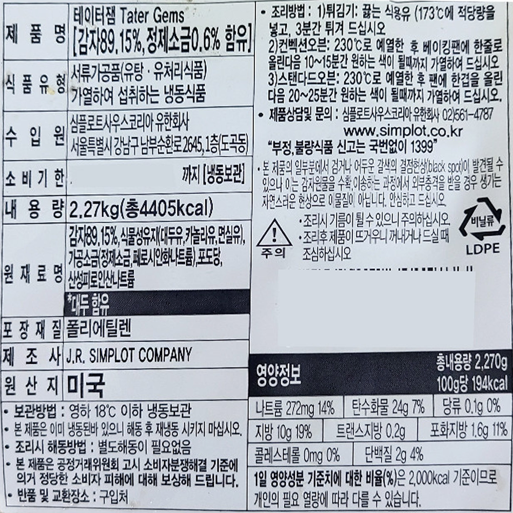 | 생산자 및 소재지(수입품의 경우 생산자, 수입자 및 제조국) | 원산지 : 미국산 수입원 : 심플로트사우스코리아(유) 제조사 : SIMPLOT BLOBAL FOOD, LLC |