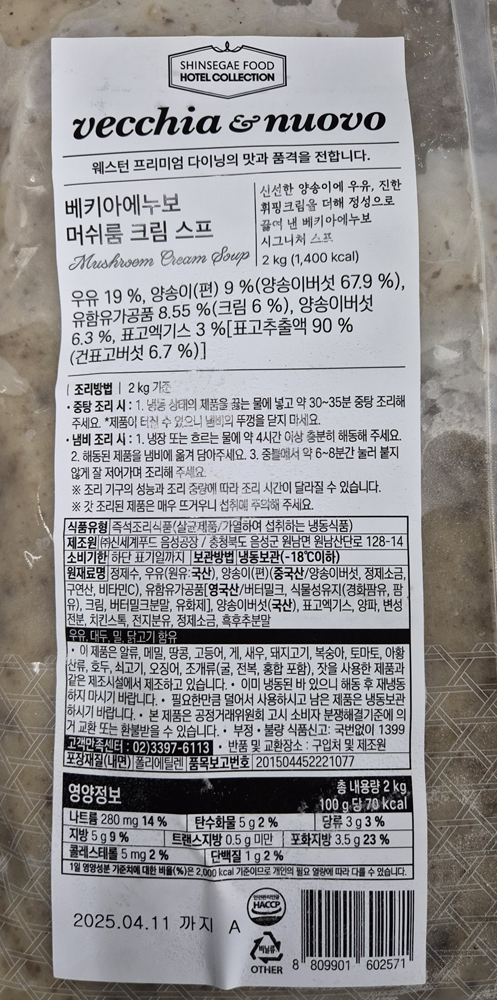 | 제품명 | 냉동 베키아에노보 머쉬룸 크림스프 2kg/신세계푸드 |