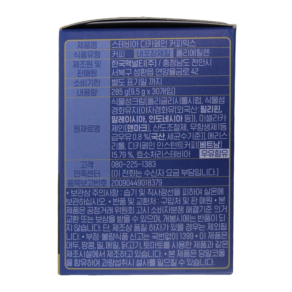 | 제품명 | 맥널티 스테비아 디카페인 커피믹스 30T /한국맥널티 |