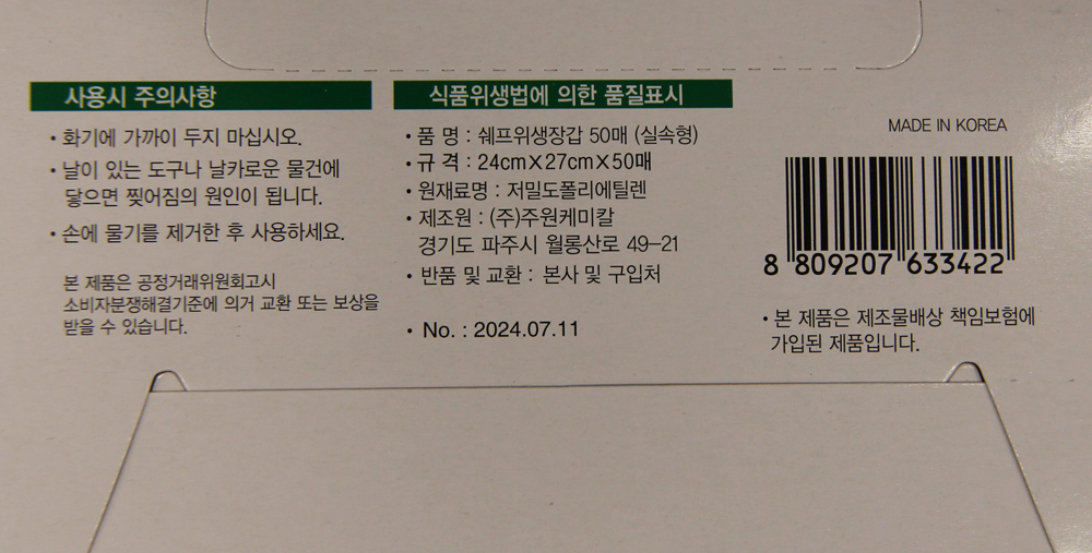 | 제품명 | 쉐프 위생장갑 50매 (실속형)/주원케미칼 |