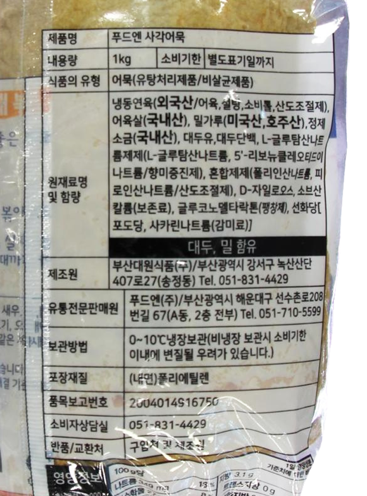 | 식품의 유형 | 어묵 (유탕처리제품/비살균식품) |