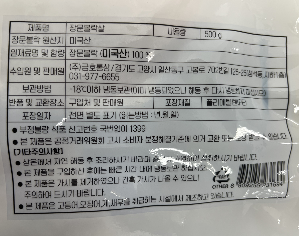 | 품목 또는 명칭 | 손질 장문볼락살 500g/금호통상 |