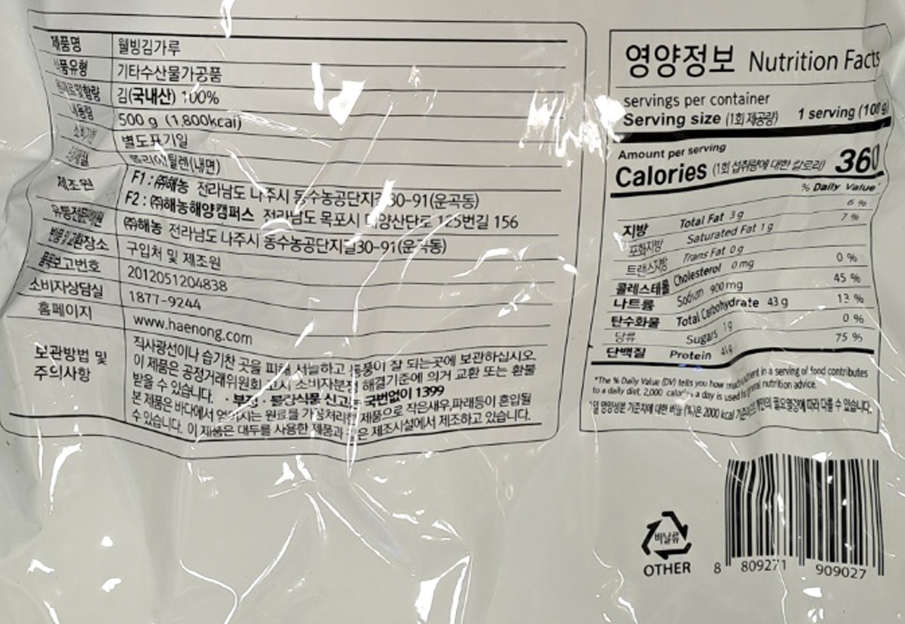 | 제품명 | 웰빙 김가루 (생김·무조미) 500g /해농 |