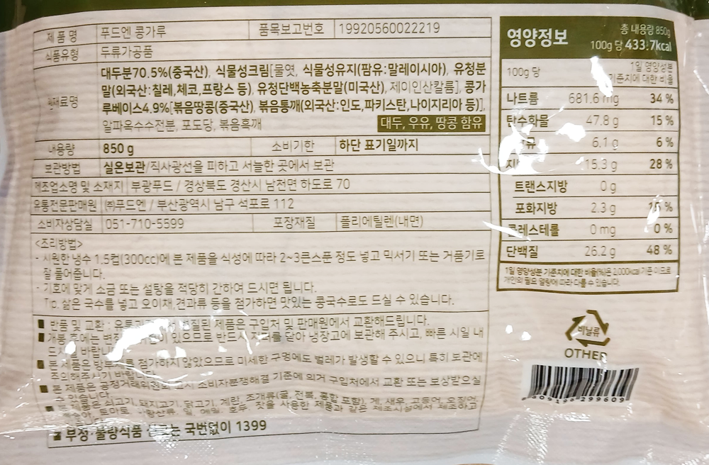 | 제품명 | 푸드엔 콩가루 850g(콩국수용)/부광푸드 |