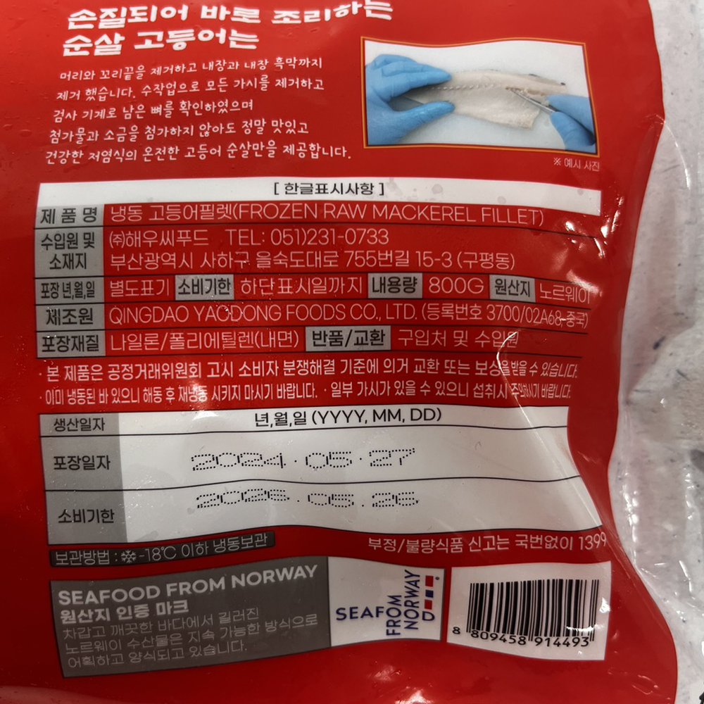 | 품목 또는 명칭 | 순살 고등어·필렛(노르웨이산) 800g/해우씨푸드 |