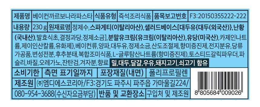 | 제품명 | 쉐프엠) 베이컨까르보나라 파스타 230g/MDS코리아 |