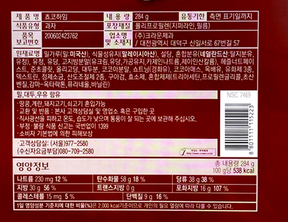 | 제품명 | 초코하임 284g/크라운제과 |