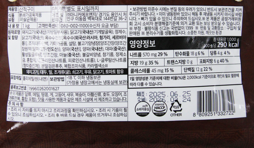 | 원재료명 및 함량(농수산물의 원산지 표시에 관한 법률에 따른 원산지 표시 포함) | 돼지고기 26.9%(국내산,지방일부사용), 닭고기 26.9%(국내산,기계발골육), 닭고기 7.34%(국내산), 불곡기양념장 2.94%, 양파 2.94%, 대파 1.96%, 마늘 0.98% |