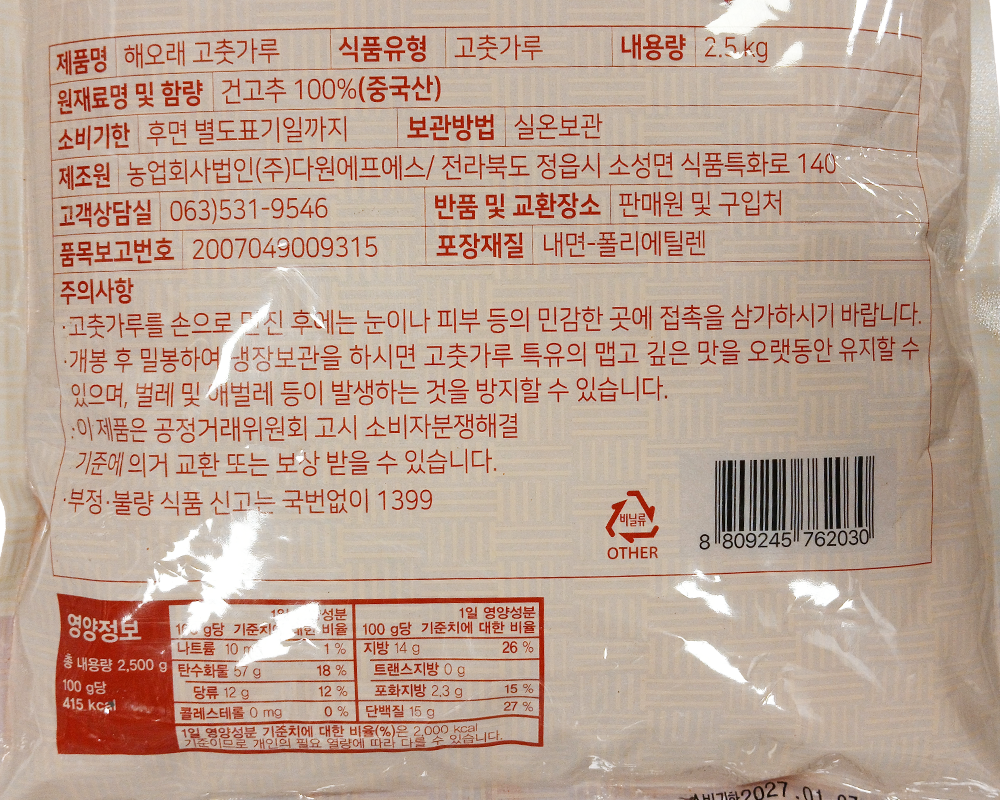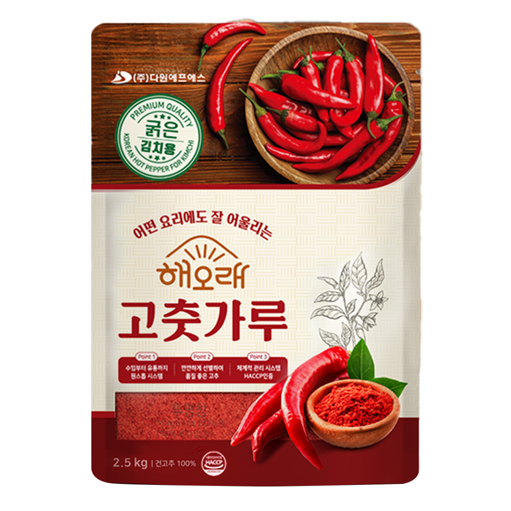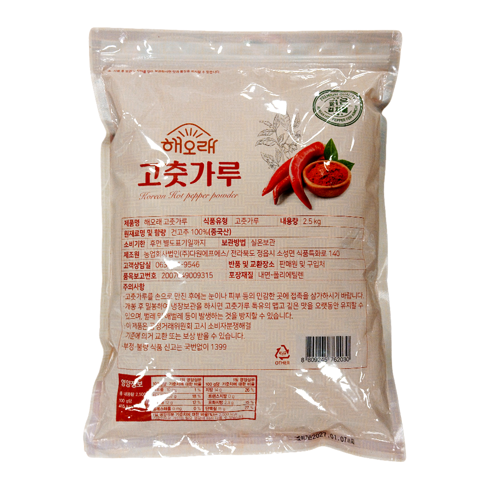 | 품목 또는 명칭 | 해오래 고춧가루 2.5kg (굵은·김치용) 중국산/다원FS |