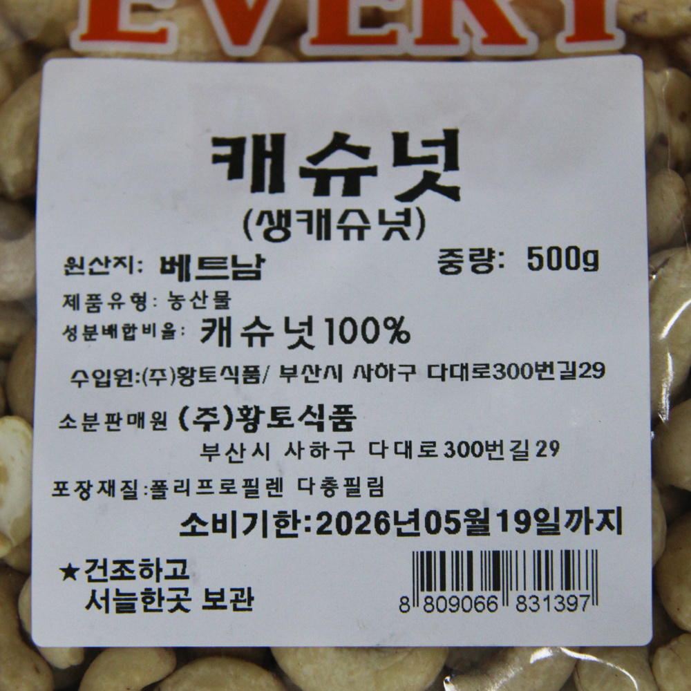 | 제품명 | 생캐슈넛(무염) 500g /황토식품 |