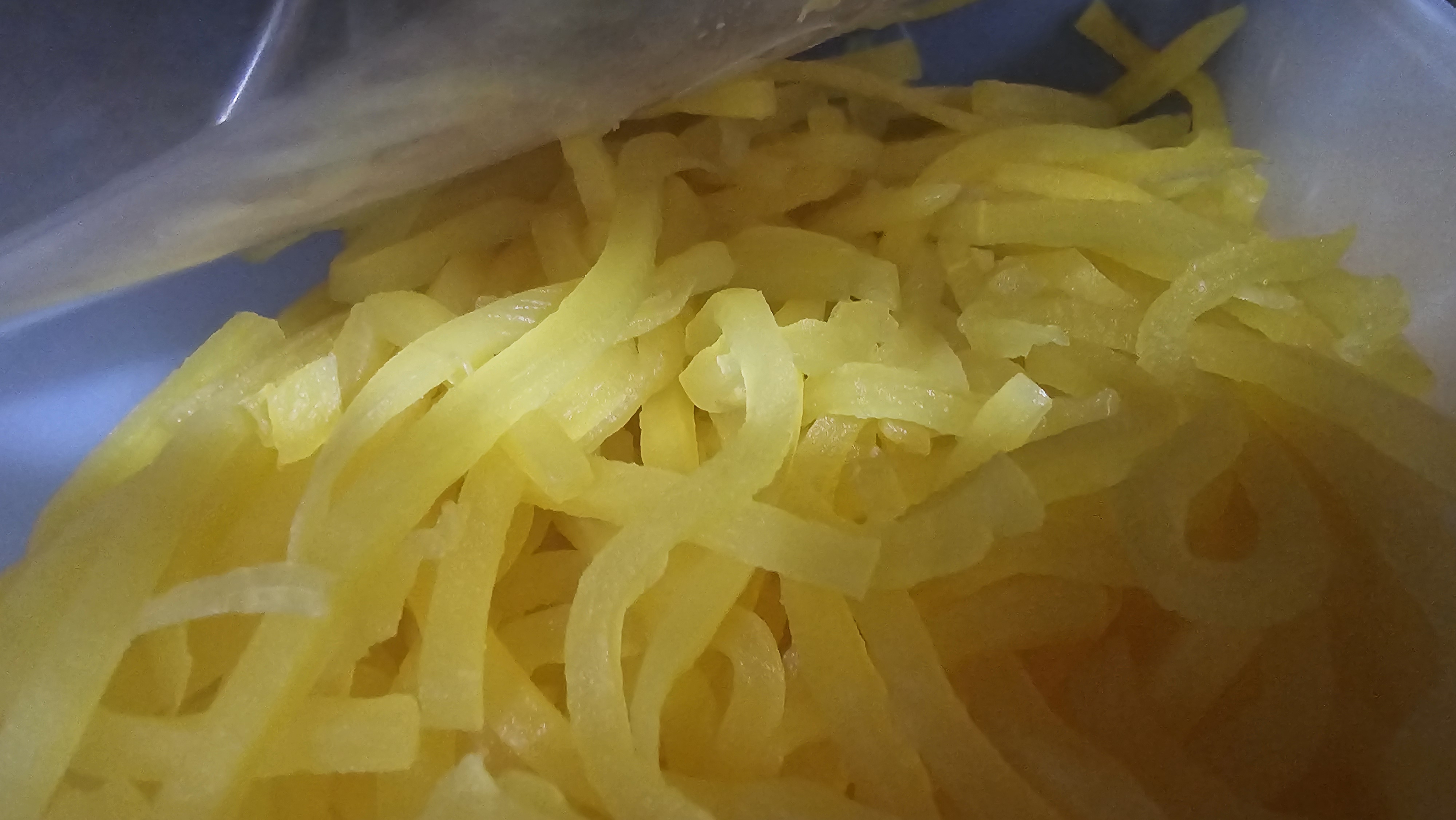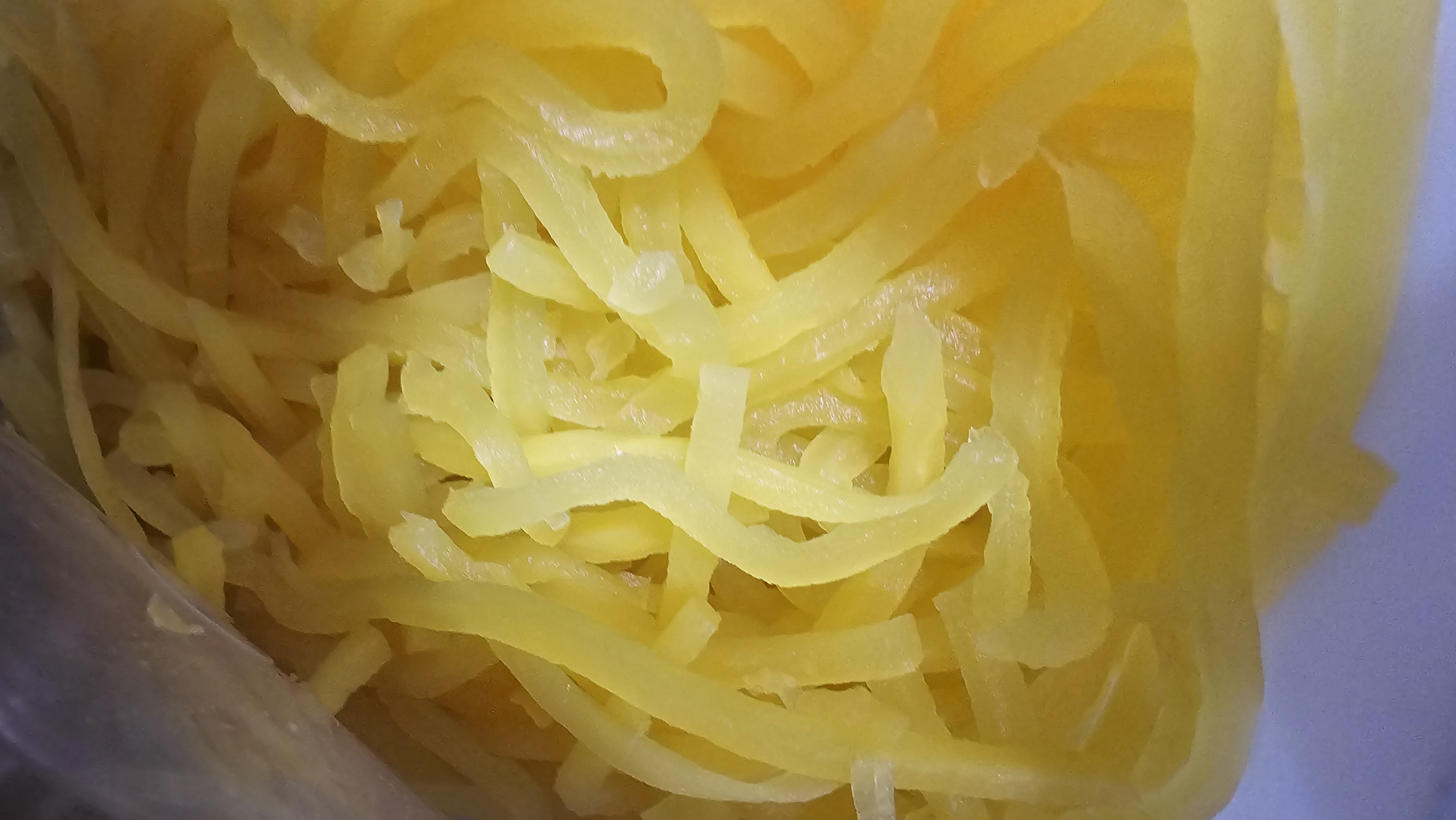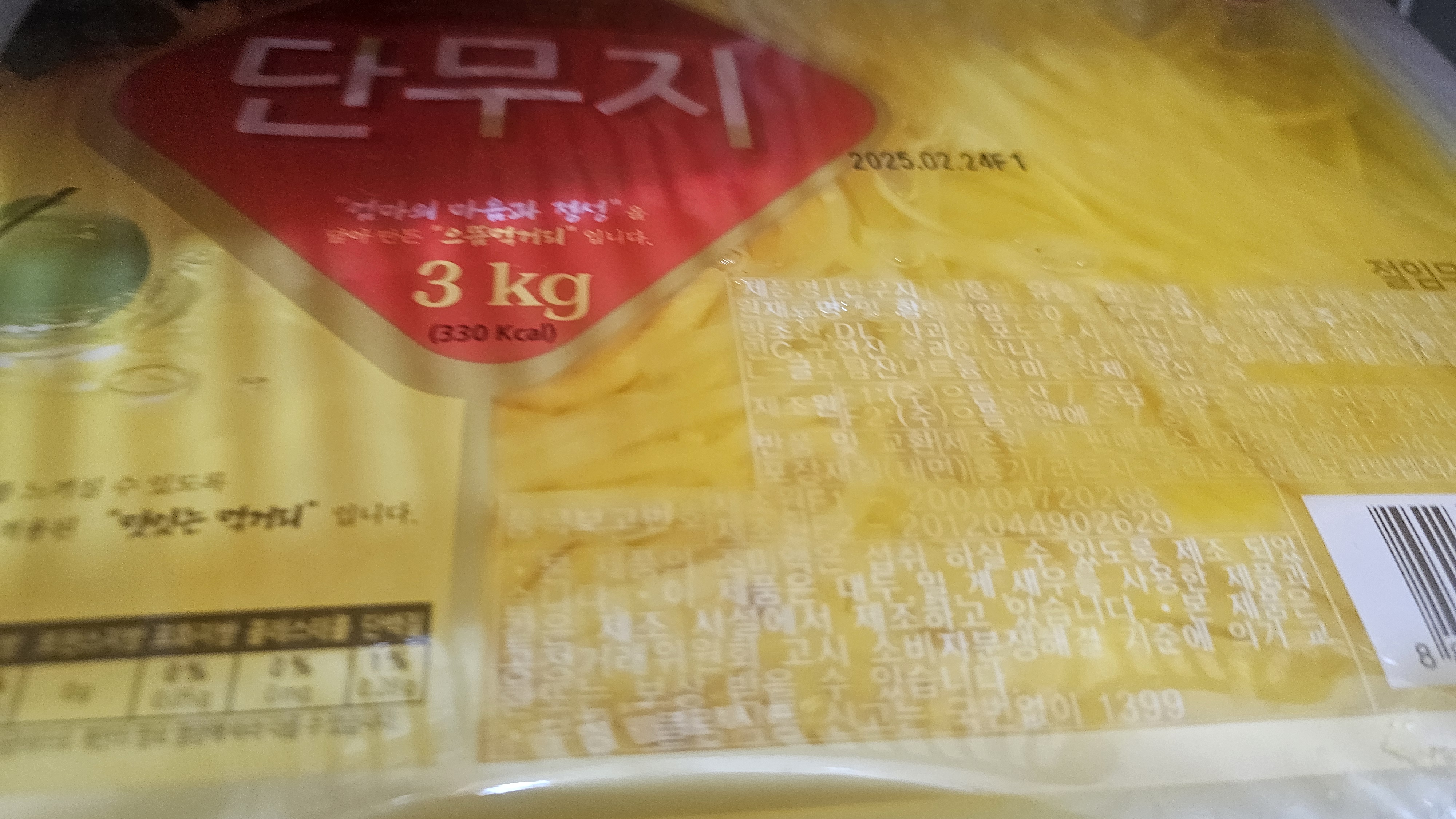 | 원재료명 및 함량(농수산물의 원산지 표시에 관한 법률에 따른 원산지 표시 포함) | 절임무60%(국산),정제수,식염(국산),빙초산(합성식초),사과산,포도당,사카린나트륨(합성감미료),소르빈산칼륨(합성보존료),비타민씨,치자황색소,젖산,구연산,폴리인산나트륨,치자황색소,염화칼슘,아황산나트륨(산화방지제),L-글루타민산나트륨(향미증진제) |