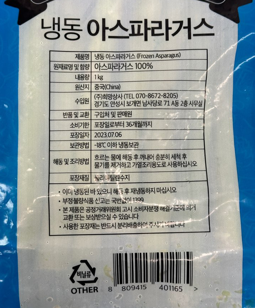 | 품목 또는 명칭 | 냉동 아스파라거스·1kg /중국산 |