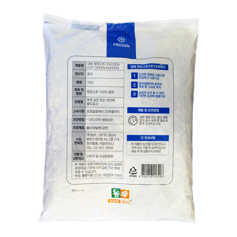 | 품목 또는 명칭 | 냉동 청양고추(슬라이스)·1kg(중국산)/농우 |