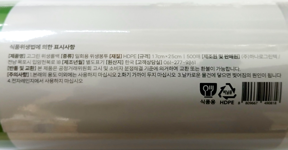 | 제품명 | 고그린 위생롤백 17*25 (500매)/하나로그린텍 |