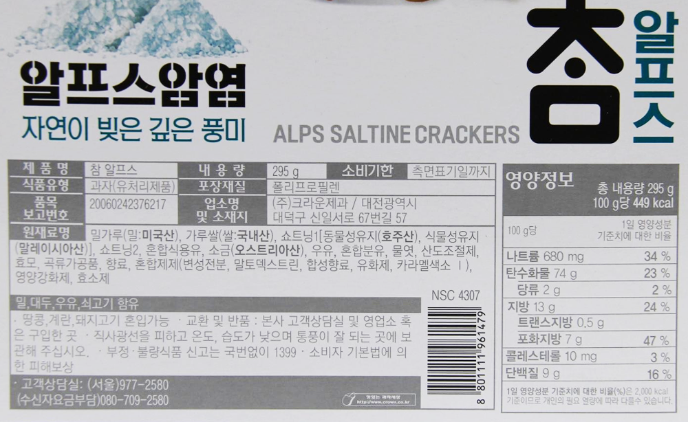 | 제품명 | 참 알프스 크래커 295g / 크라운제과 |