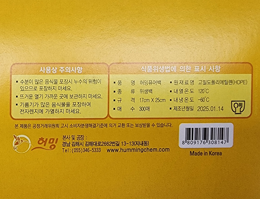 | 제품명 | 허밍) 퓨어백 17*25 (300매) /허밍 |