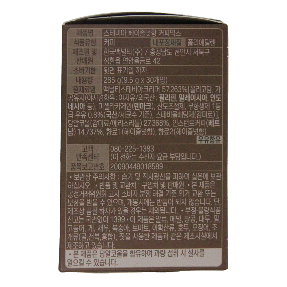 | 제품명 | 맥널티 스테비아 헤이즐넛 커피믹스 30T /한국맥널티 |