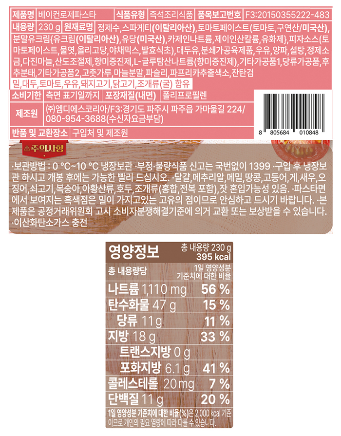 | 제품명 | 쉐프엠) 베이컨로제파스타 230g/MDS코리아 |