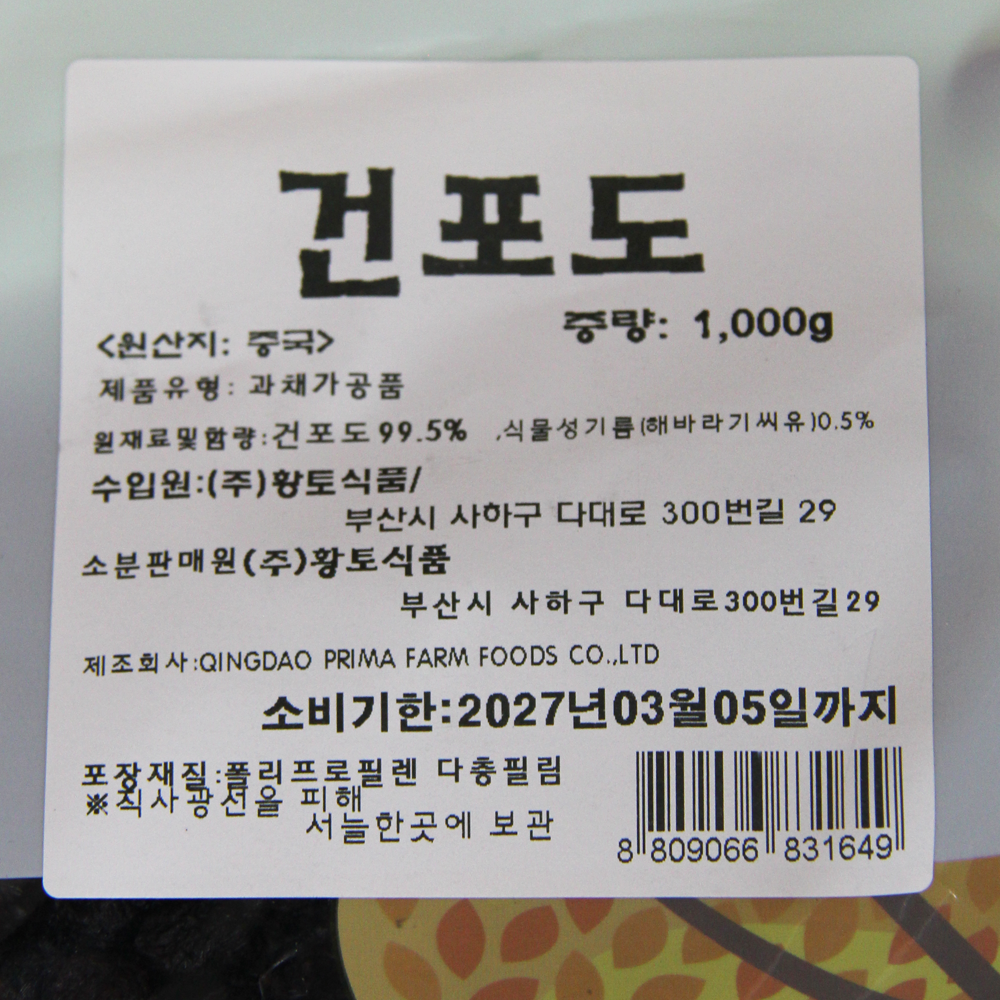 | 생산자 및 소재지(수입품의 경우 생산자, 수입자 및 제조국) | 원산지 : 중국산 수입원 : (주)황토식품 소분원 : (주)황토식품 |