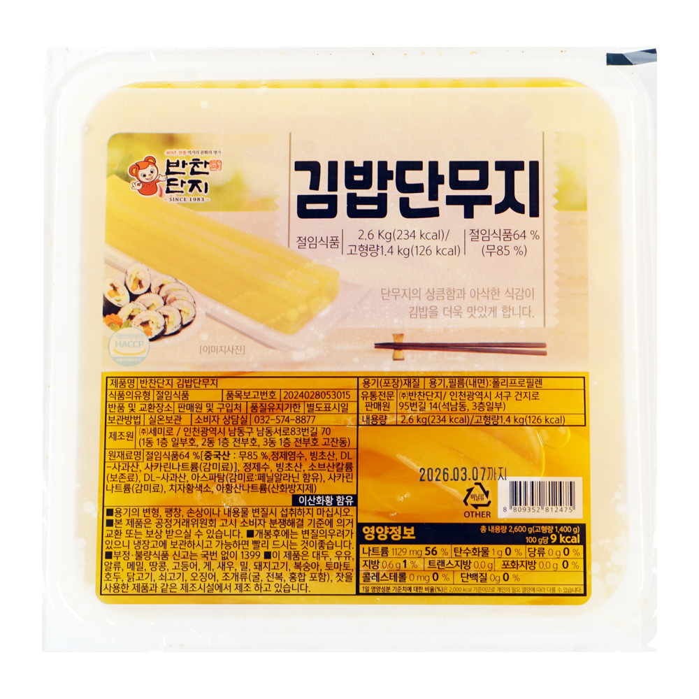 | 제품명 | 반찬단지 김밥단무지 2.6kg/세미로 |