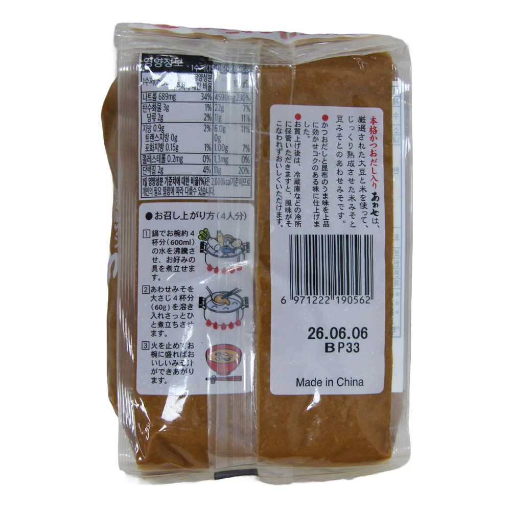 | 원재료명 및 함량(농수산물의 원산지 표시에 관한 법률에 따른 원산지 표시 포함) | 된장(94.810%), 대두(중국)(53.540%)쌀, 정제소금,주정,향미증진제 (L-글루탐산나트륨), 대두단백가수분해물,가다랑어포추출물(가다랑어포, 정제소금, 주정, 정제수),호박산이나트륨,다시마추출물 |