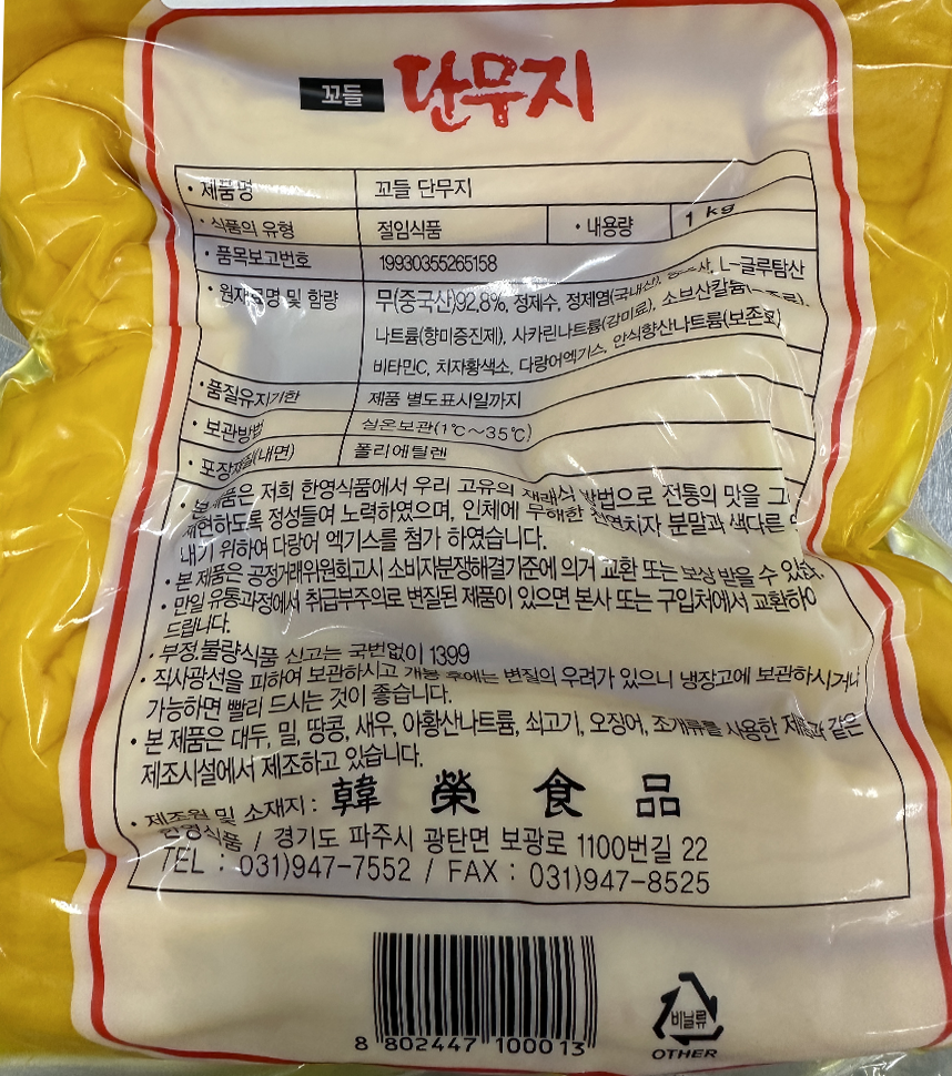| 제품명 | 꼬들(홀)단무지 1kg/한영식품 |