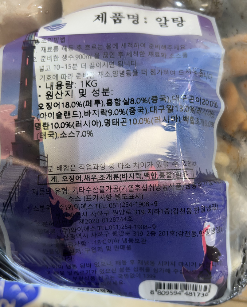 | 품목 또는 명칭 | 냉동 알탕 1kg (양념포함)/와이에스 |