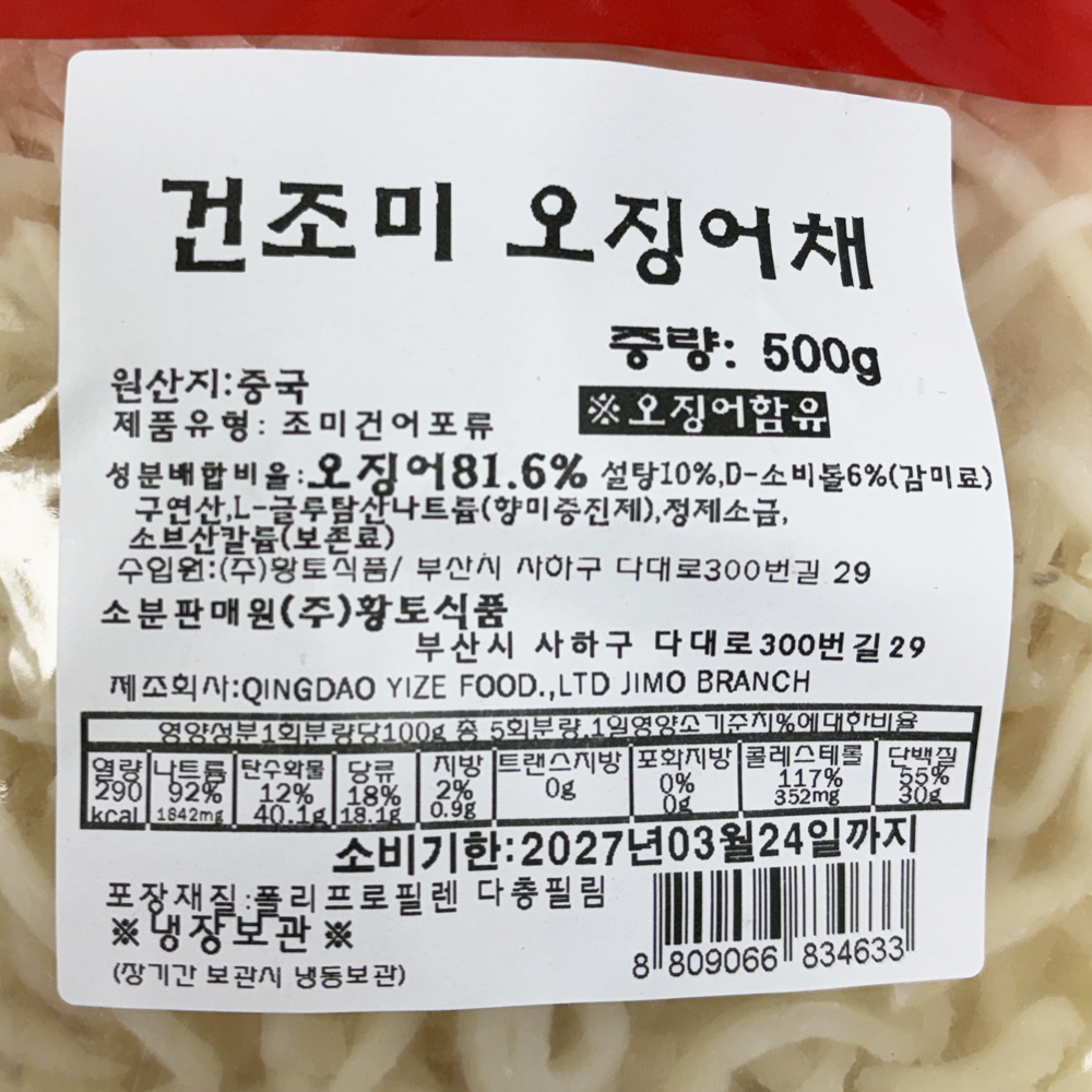| 품목 또는 명칭 | 건조미 오징어채(백진미) 500g/황토식품 |