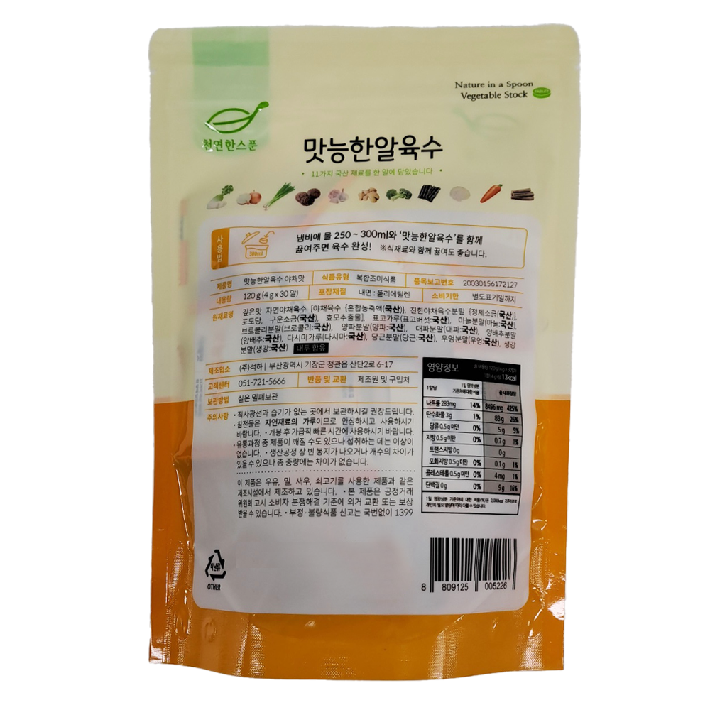 | 제품명 | 맛능 한알육수(야채맛) 120g/석하 |