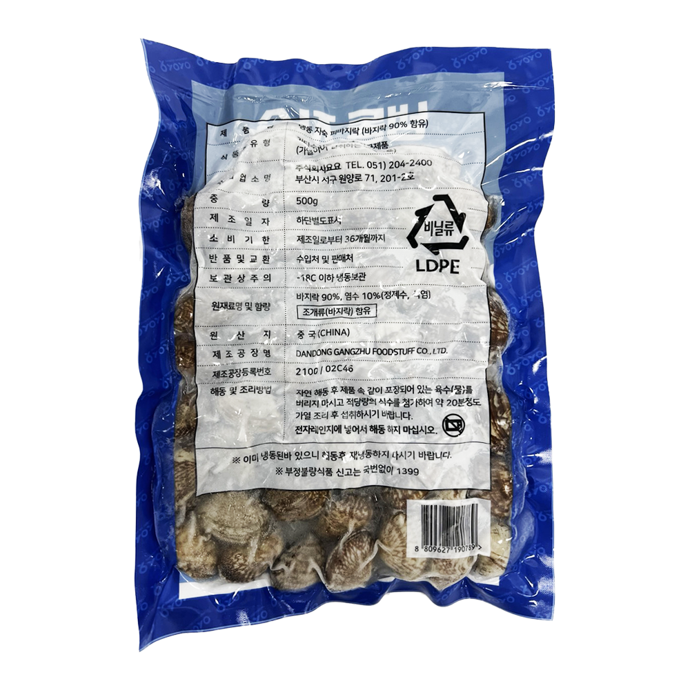 | 품목 또는 명칭 | 냉동 자숙 피바지락(육수포함) 500g/요요 |