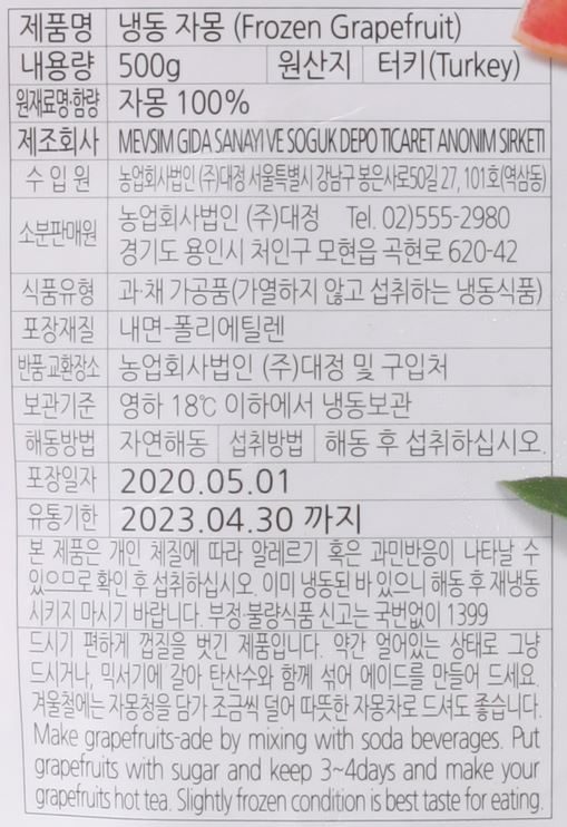 | 품목 또는 명칭 | 냉동 자몽·500g(터키산)/대정 |
