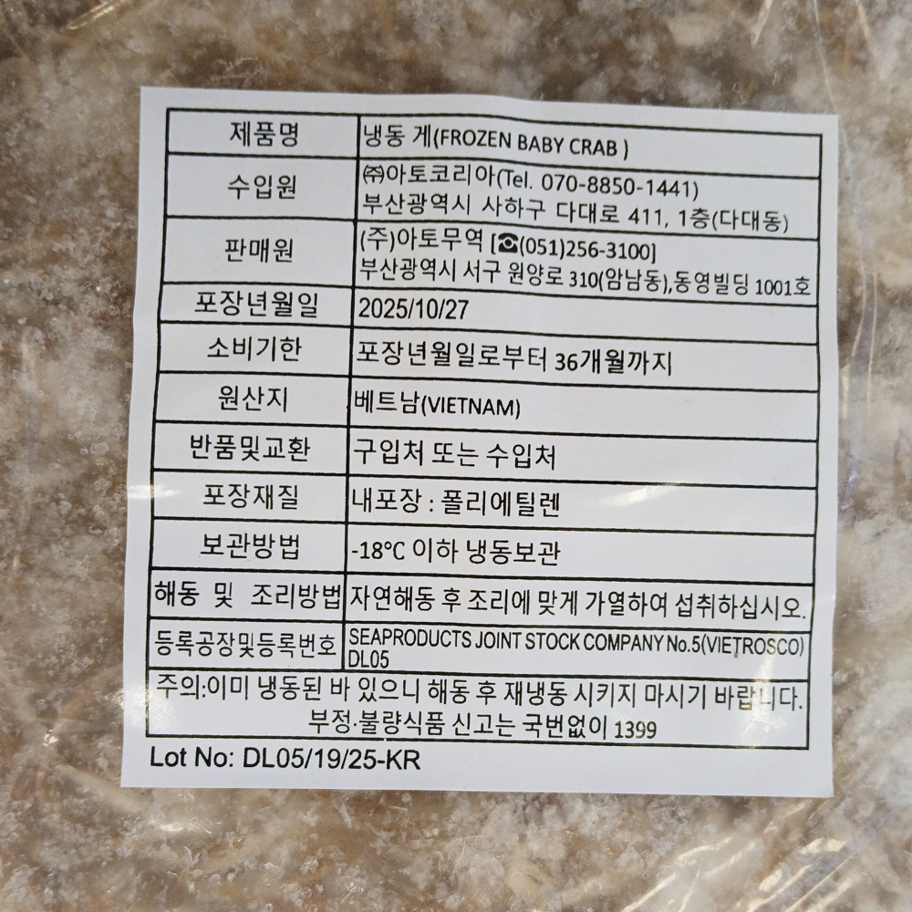 | 품목 또는 명칭 | 냉동 게(베이비크랩) 1kg/베트남산 |