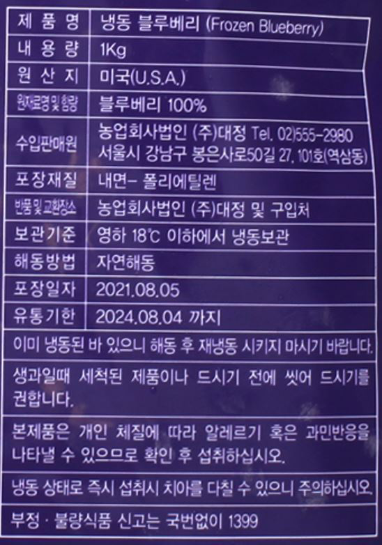 | 품목 또는 명칭 | 냉동 블루베리(미국산)·1kg/대정 |