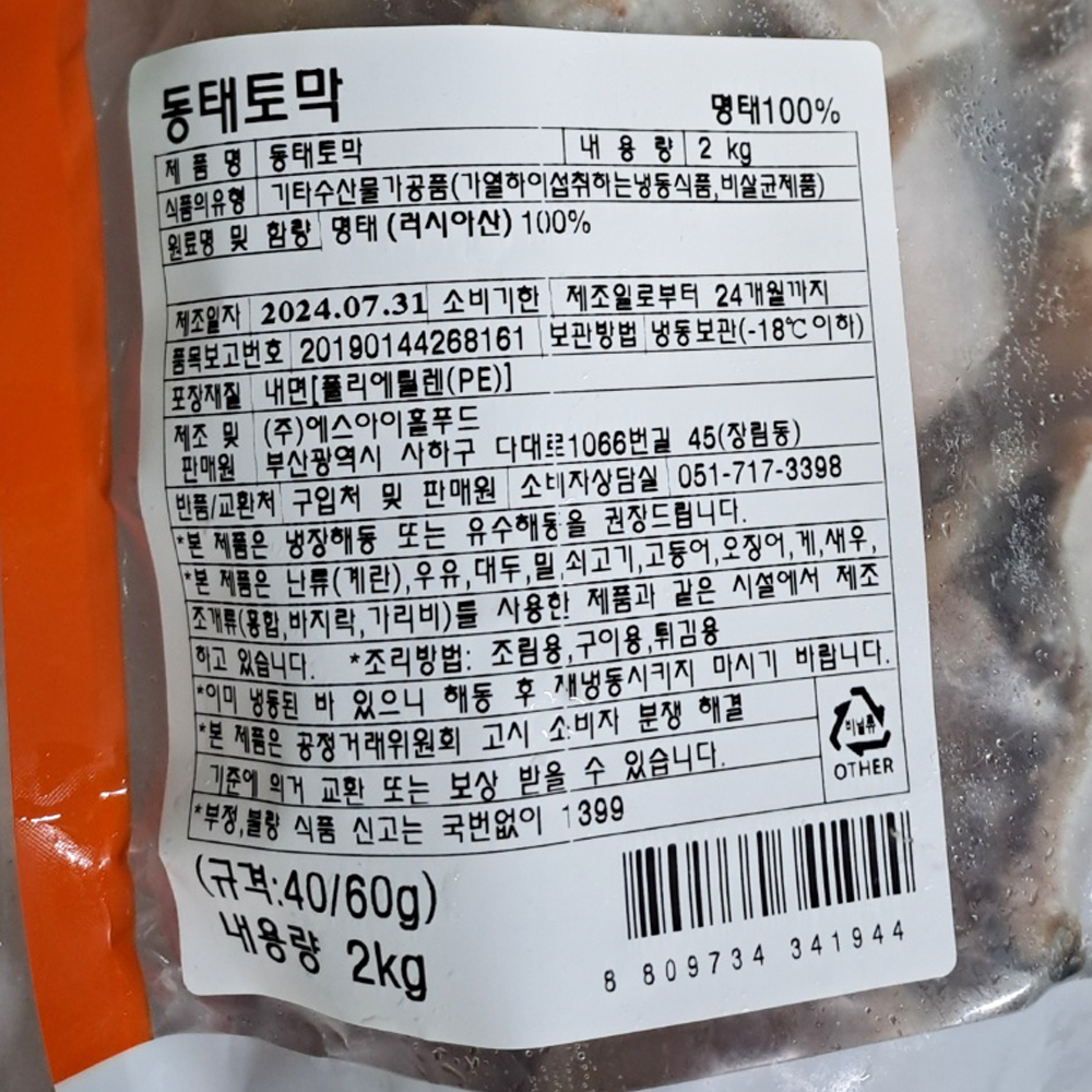 | 품목 또는 명칭 | 동태 토막 2kg/에스아이홀푸드 |