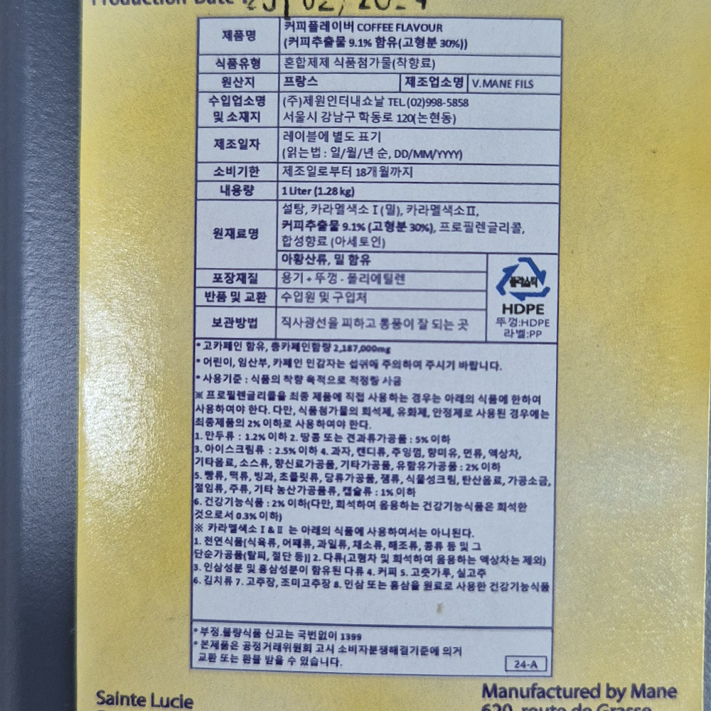 | 제품명 | 커피플레이버 1L/제원(프랑스산) |