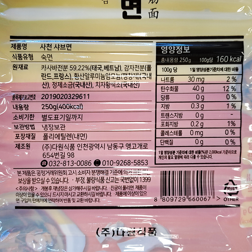 | 제품명 | 사천샤브면 (뉴진면) 250g/다원식품 |