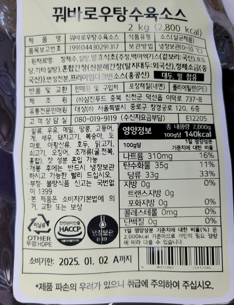 | 생산자 및 소재지(수입품의 경우 생산자, 수입자 및 제조국) | 제조사 : 삼진푸드 |