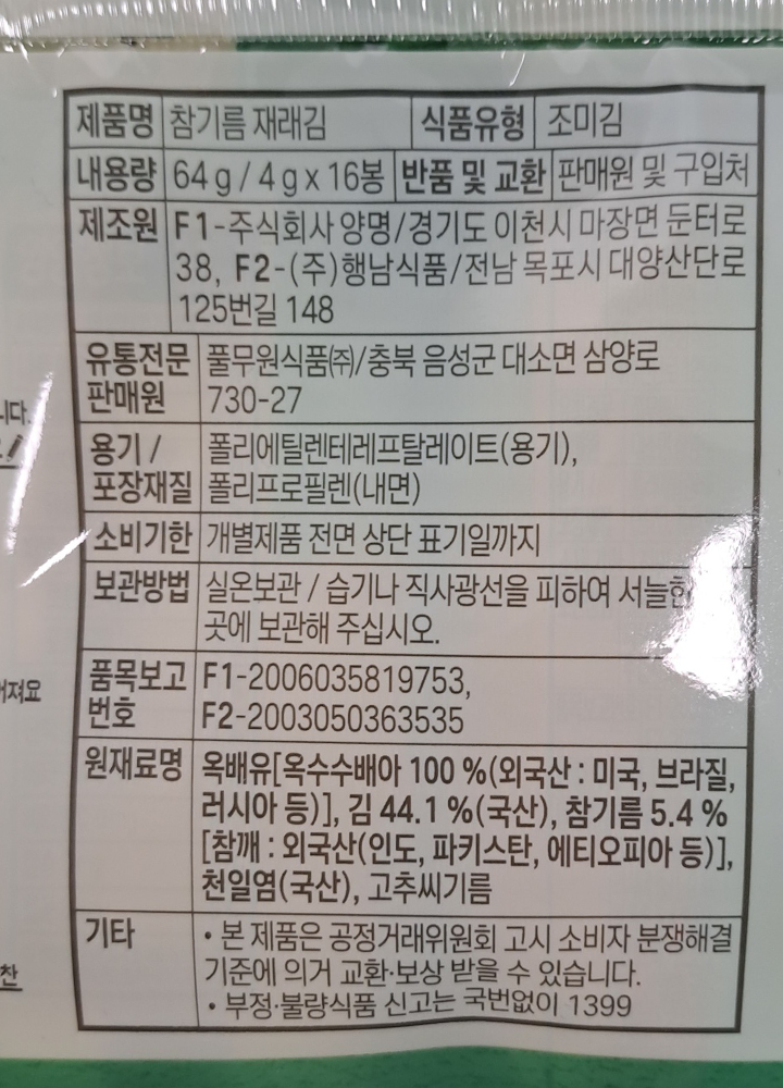 | 원재료명 및 함량(농수산물의 원산지 표시에 관한 법률에 따른 원산지 표시 포함) | 옥배유,김44.4%,참기름5.4%, |