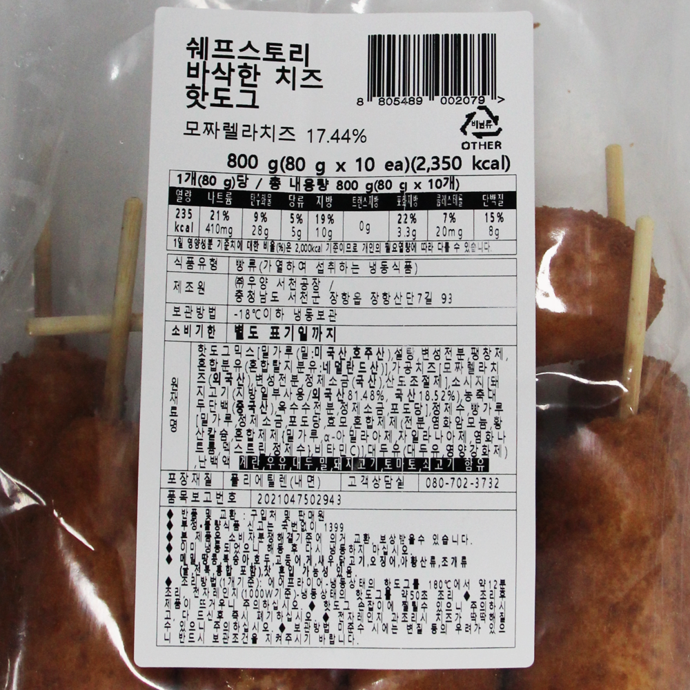 | 제품명 | 쉐프스토리 바삭한 치즈·핫도그 800g/우양 |