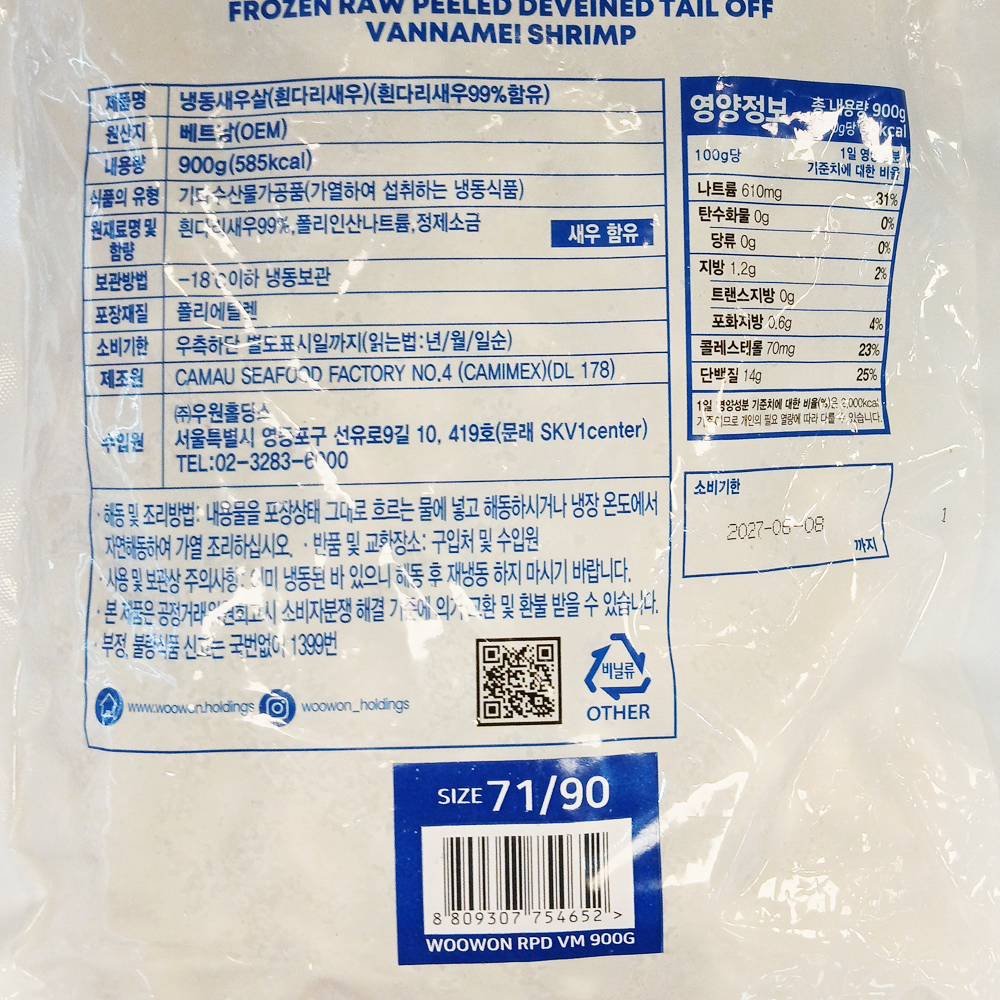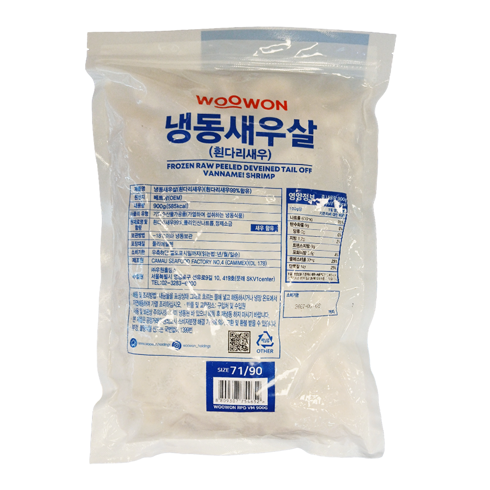 | 품목 또는 명칭 | 냉동흰다리새우살 900g(71/90)/베트남산(우원) |